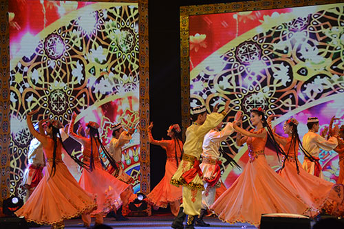启动仪式中,以宣扬新疆传统手工艺的“艾德莱斯炫昆仑”展演走进和田,20位美丽的“女神”穿着设计时尚的艾德莱斯服装“勇敢”上场走秀,并以一首歌舞《夸新疆》表达自己对家乡和人民的真挚感情。