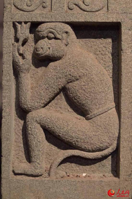 哈奴曼是印度史诗《罗摩衍那》的神猴。罗摩是大神毗湿奴化身,他的妻子非常美丽,被楞伽城十头魔王罗波那用计劫走。罗摩在寻妻途中助猴王须羯哩婆夺得王位。猴王派手下大将哈努曼随罗摩去寻妻。哈奴曼勇敢机敏,能腾云驾雾,火烧楞伽宫,盗仙草,终于帮助罗摩征服了强敌,救出悉多。这刻画在印度教寺庙门柱上的哈努曼形象就表现了他盗仙草的故事。记者翁奇羽/摄