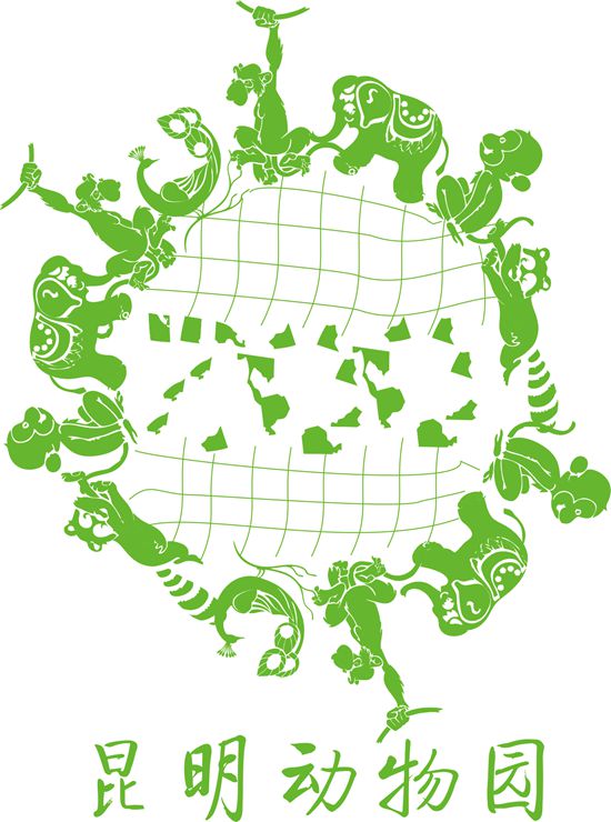 标志的主体是一个地球,体现昆明动物园的动物种类之多来自世界各地,将昆明动物园的五种代表性动物以卡通形象剪影的形式围绕在地球周围可以体现童真,迎合动物园的主体游客小朋友们的喜好。地球中间用地图上的小板块碎片拼成的zoo便于识别,周围的网格线既是地球的标识又可以看成保护动物的篱笆,体现昆明动物园保护野生动物这一理念。标志整体采用绿色为主色调,更体现昆明动物园注重自然和谐。