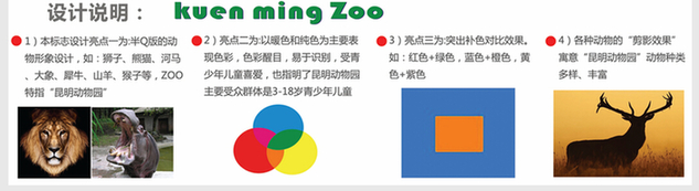 1)本标志设计亮点一为:半Q版的动物形象设计,如:狮子、熊猫、河马、大象、犀牛、山羊、猴子等,ZOO特指“昆明动物园”