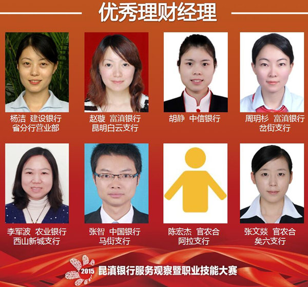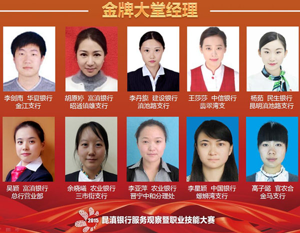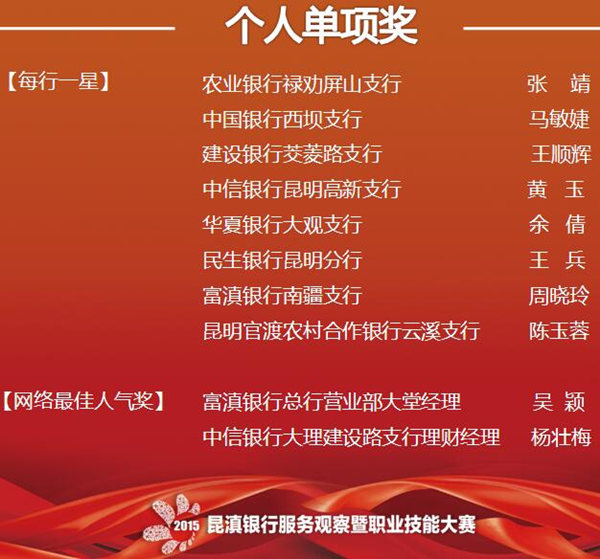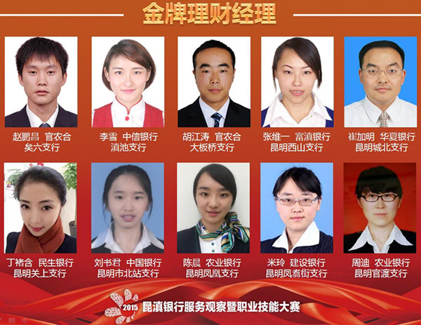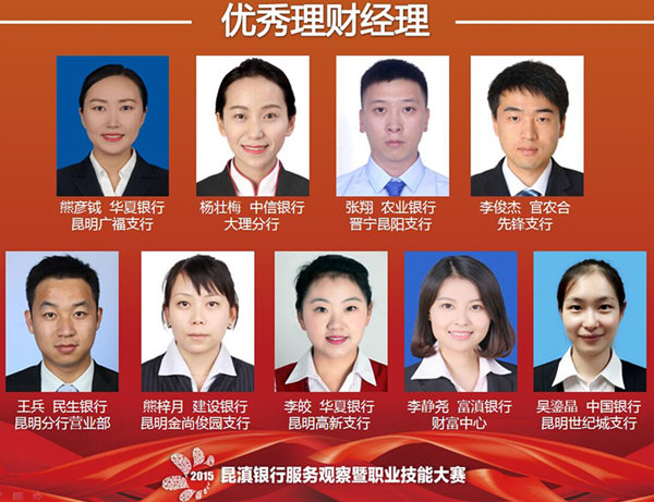 华夏银行金江支行李剑南、富滇银行昭通镇雄支行胡原婷、建设银行昆明滇池路支行李丹旎、中信银行翡翠湾支行王莎莎等10名选手荣获“2015年昆滇金牌大堂经理”称号;昆明官渡农村合作银行矣六支行赵鹏昌、中信银行昆明滇池路支行李雪、富滇银行昆明西山支行张维一、华夏银行昆明城北支行崔加明等10名选手荣获“2015年昆滇金牌理财经理”称号,其余35名选手分别获得“2015年昆滇优秀大堂经理”和“2015年昆滇优秀理财经理”荣誉。