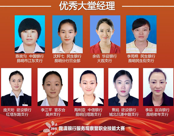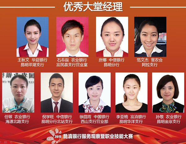 选手个人总成绩由所在银行暗访成绩、在线笔试成绩和决赛现场成绩构成,决出10名“2015年昆滇金牌大堂经理”和10名“2015年昆滇金牌理财经理”。
