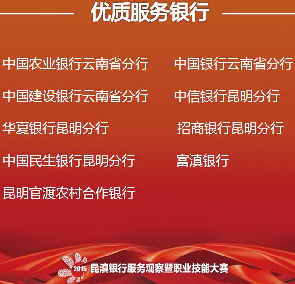 昨日,“2015’昆滇银行服务观察暨职业技能大赛”在昆明市职工之家举行颁奖典礼,完美落下帷幕。