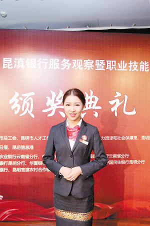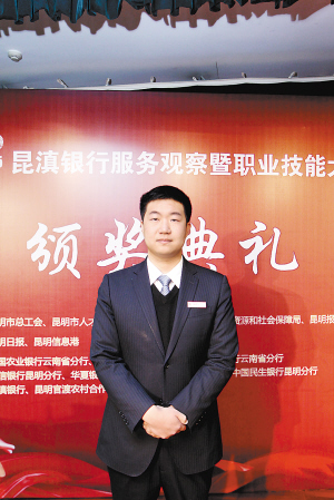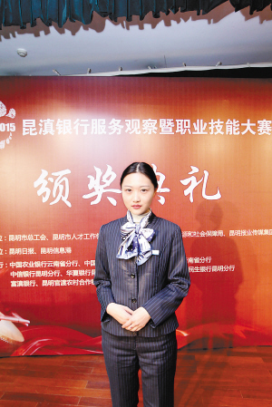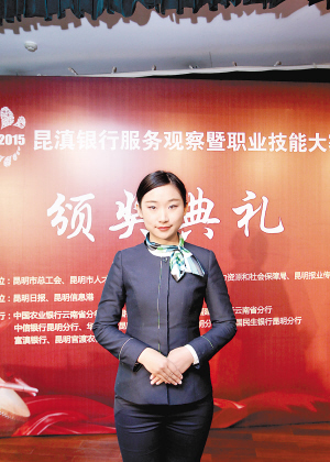 获奖感言:我很高兴能够获得“2015昆滇银行服务观察暨职业技能大赛”金牌大堂经理的称号,在以后的工作中,我一定会更加努力。