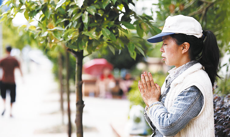 昆十中求实校区考场一名家长祈祷孩子能考个好成绩