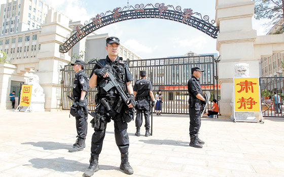 反恐应急巡逻中队的民警镇守昆一中考点门口