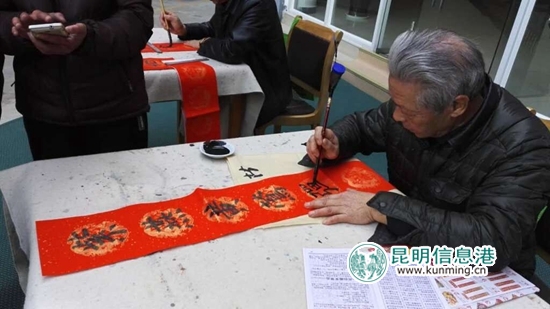 昆明信息港讯 通讯员熊楠 熊艳琳 张云洪 “三羊开泰人膺五福趁春去 ,万猴维新天降大运随日至”。2016年春节前夕,官渡区老干部局组织老年大学,老干部活动中心书法高级班的学员和爱好书法的老干部,在关上日新路开展了为老年人、老干部、群众书写春联送祝福活动,为他们献上一幅幅充满喜庆吉祥寓意的春联。