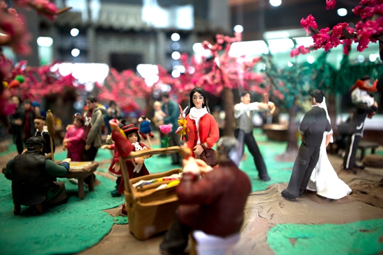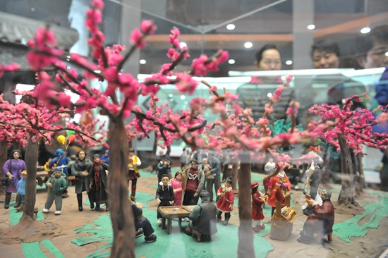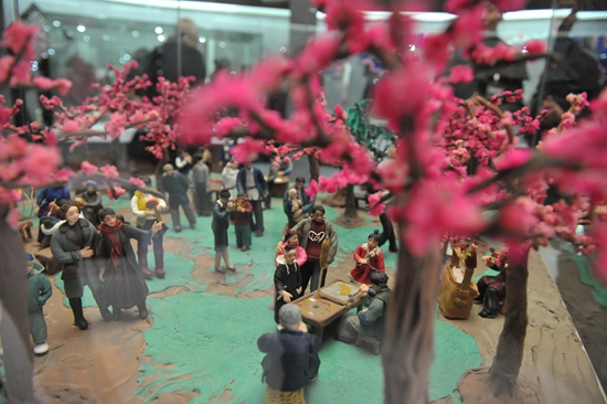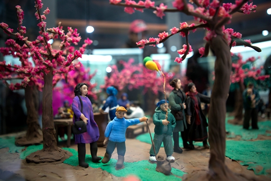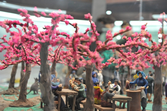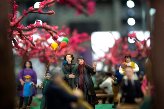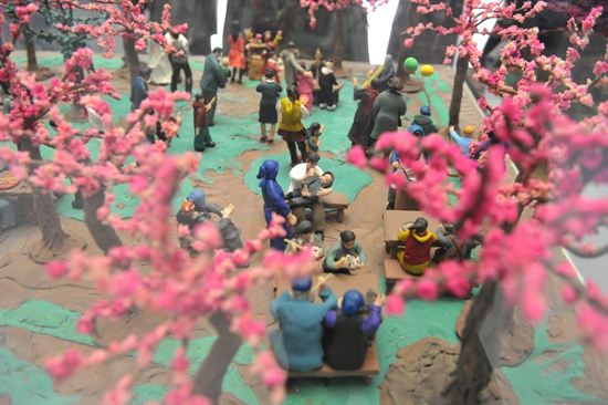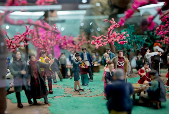面塑工艺复杂多变,形式多样,或山石、或树木、或动物、或肖像;在肖像中,又多以四大名著以及众多民间传统人物及自创人物为主。省级传承人梁俊丽的作品多以再现昆明本土的老行当、老手艺人为主,充满了浓郁的“昆明味道”。此次的作品是以“圆通樱潮”为主题而创作的一组人物动态,当中人物形象栩栩如生,樱花惟妙惟肖,充分展现了花海人潮的民俗盛景。而且当中还隐藏着一些同为“非物质文化遗产”的项目,期待细心的观众一一去发现。