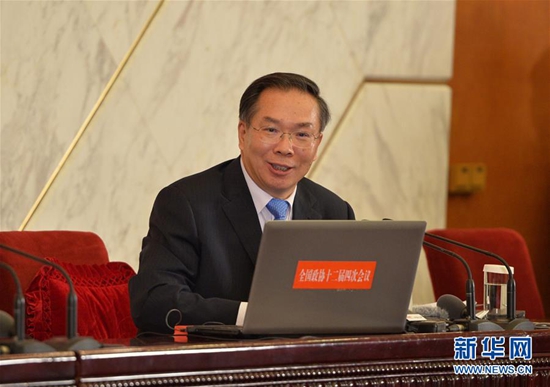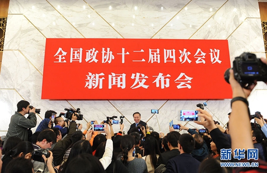 3月2日,全国政协十二届四次会议新闻发布会在北京人民大会堂举行,大会新闻发言人王国庆介绍会议有关情况并回答中外记者提问。 新华社 记者殷刚/摄