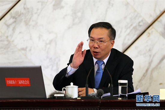 3月2日,全国政协十二届四次会议新闻发布会在北京人民大会堂举行,大会新闻发言人王国庆介绍会议有关情况并回答中外记者提问。这是王国庆在发布会上回答记者提问。新华社 记者殷刚/摄