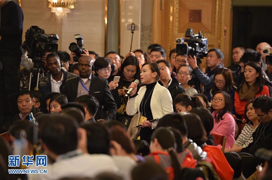 3月2日,全国政协十二届四次会议新闻发布会在北京人民大会堂举行,大会新闻发言人王国庆介绍会议有关情况并回答中外记者提问。这是记者在发布会上提问。新华社 记者李鑫/摄