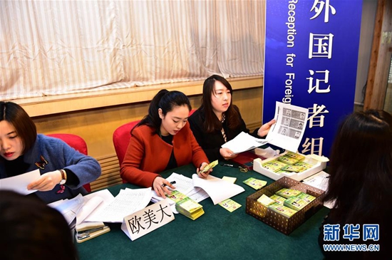 3月1日,两会新闻中心外国记者组的工作人员在发放记者证。