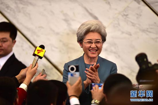 3月4日,十二届全国人大四次会议在北京人民大会堂举行新闻发布会。大会发言人傅莹就大会议程和人大工作相关的问题回答中外记者的提问。这是发布会后,傅莹准备离开会场。新华社记者刘军喜摄