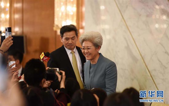 3月4日,十二届全国人大四次会议在北京人民大会堂举行新闻发布会。大会发言人傅莹就大会议程和人大工作相关的问题回答中外记者的提问。这是傅莹在发布会后和记者交流。新华社记者陈晔华 摄