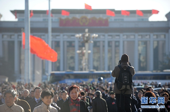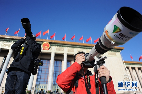 3月11日9时,全国政协十二届四次会议在人民大会堂举行第三次全体会议,多名政协委员将就相关议题作大会发言。图为采访大会的记者在大会堂外广场上拍摄。新华网 记者陈竞超/摄