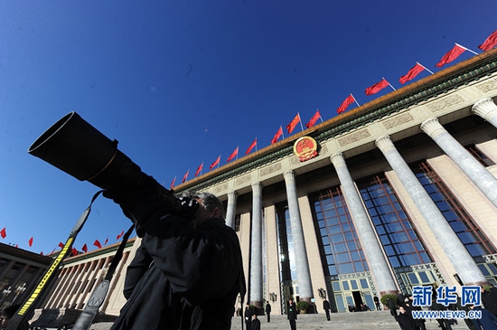 3月11日9时,全国政协十二届四次会议在人民大会堂举行第三次全体会议,多名政协委员将就相关议题作大会发言。图为采访大会的记者在大会堂外广场上拍摄。新华网 记者陈竞超/摄