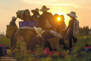 在夕阳下劳作的花农 都市时报首席记者 张玉杰/摄