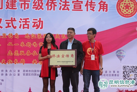 昆明信息港讯 通讯员熊楠 张云洪 出国探亲要办理哪些相关手续?侨眷子女参加高考由哪些优惠政策?近日,官渡区关上中心区社区创建市级侨法宣传角授牌仪式在银海尚御幸福广场举行,今后,这些涉及到归侨侨眷的优惠政策和相关维权、服务问题,都能在宣传角找到答案和帮助。