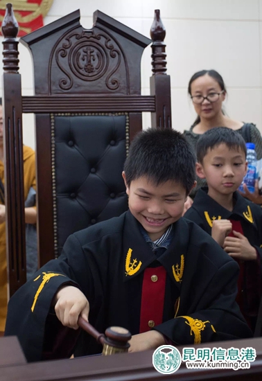 “开庭!”随着法锤敲下,官渡法院的法官以一个校园伤害的真实案例为孩子们带来了一场模拟法庭,同时邀请了家长们一起旁听,全程真实还原法院开庭,法官、法警、书记员、原被告全部由官渡法院工作人员扮演。严肃的庭审现场,让平时调皮的小男孩们,都正襟危坐。以一场模拟法庭的形式,给这些平均年龄7—14的孩子们,上了一堂生动的法律课。最后,官渡法院还为孩子们准备了5件法袍,让孩子们在现场试穿,一次神秘的探索之旅给孩子们划上了圆满的句号。