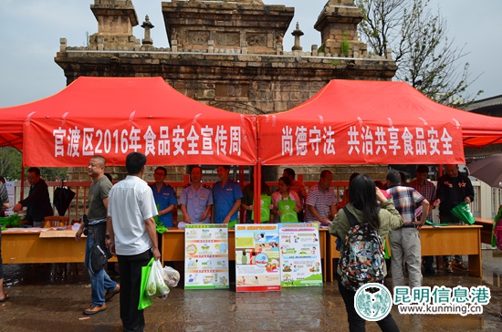 昆明信息港讯 通讯员王颖 苏文忠 第4届南博会开幕了,官渡区食安办联合区农林局等10家单位,在官渡古镇金刚塔开展了主题为“尚德守法 共治共享食品安全”2016年食品安全宣传周活动助力南博,社区居民数百人参加了活动。