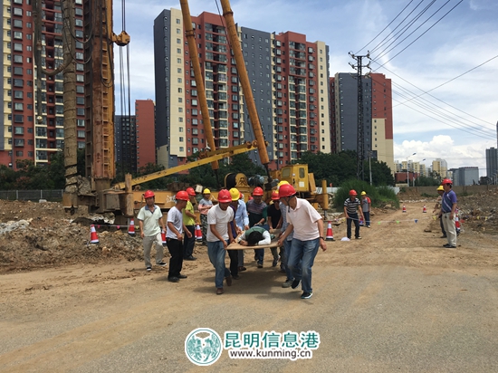下午2点,随着现场指挥长的一声令下,演练正式开始。演练中,在11号路建设项目施工现场大型打桩机正在高空作业,忽然高空坠物,砸伤一名正在工地上施工的工人,附近工人立即展开营救,把受伤工人移到安全地带,拉起警戒线,拨打120急救电话,同时向企业负责人和保险公司报告事故情况。随后,120医护人员到达现场迅速对受伤工人进行临时包扎救治,并将受伤工人抬上救护车赶赴医院作进一步治疗。