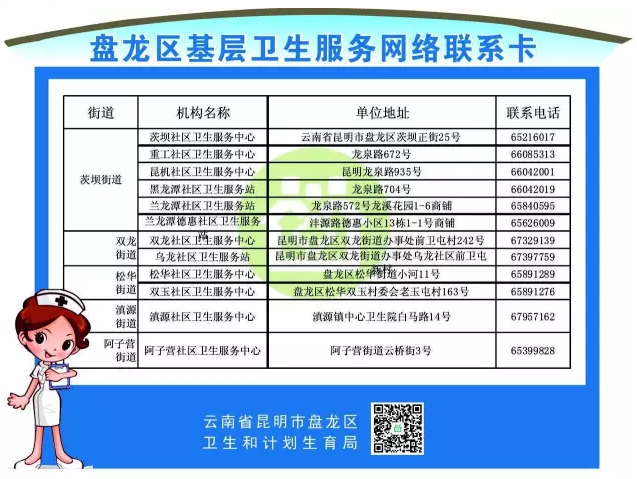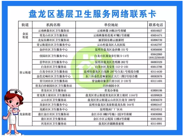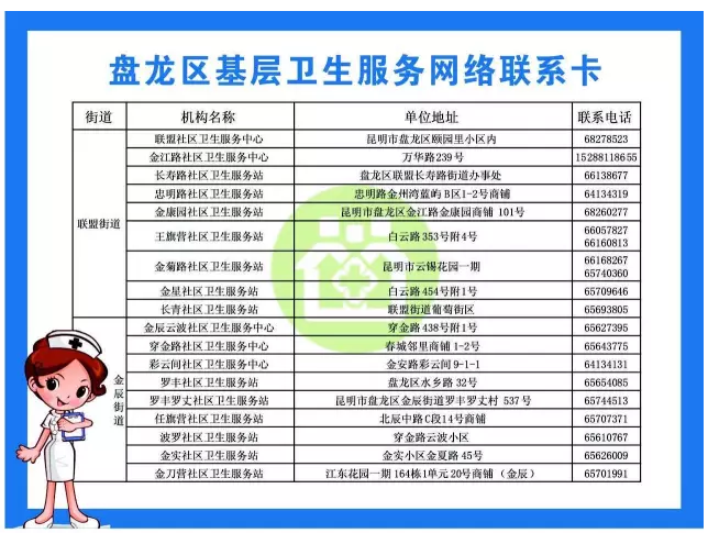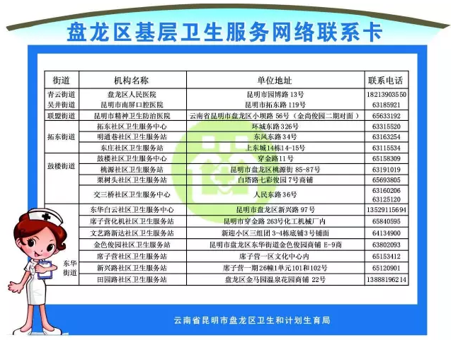 基层卫生服务网络联系卡的内容主要以盘龙区辖区内的各医院、社区卫生服务中心的地址及联系方式为主,让居民能够选择所需的就医场所,并为其提供服务。