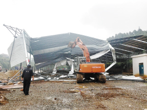 在经开区洛羊街道黄土坡社区水海子村内的一片空地上,有一座占地约5500平方米的钢架大棚,据悉该大棚是在没有办理任何审批手续的情况下修建的。昨日,经开区城市管理综合行政执法局联合公安、洛羊街道办事处出动近百名工作人员,对该违法建筑进行了助拆。