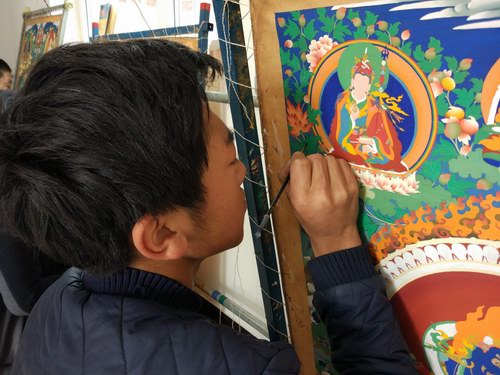 (年仅15岁的周智多杰在班玛县唐卡手工艺制作销售厂里专心学习唐卡技艺)
