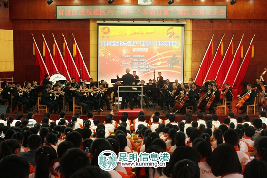 昆明信息港讯 通讯员林增 杨富洪 10月11日下午,慷慨激昂的旋律、脍炙人口的曲调从官渡区小板桥中学报告厅缓缓流出,庆祝官渡区建区六十周年“幸福官渡”惠民交响音乐会在这里举行,来自小板桥中学的600余名师生和嘉宾一起享受了一场精彩的视听盛宴。