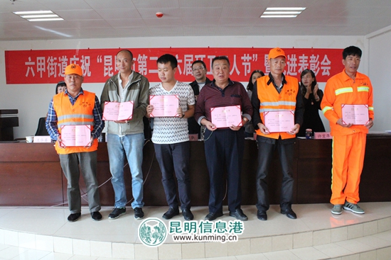 在“昆明市第二十六届环卫工人节暨先进表彰会”上,六甲街道对5个环卫工作先进集体、14位优秀环卫管理工作者和26名“城市美容师”进行了表彰,感谢他们对城市清洁做出贡献和辛苦付出。