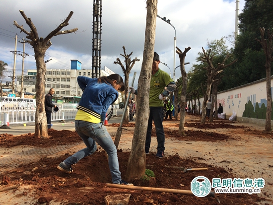 10月26日上午,在日新路官渡大酒店附近路段,十多名绿化工人正在对街道上枯死的小叶榕进行移除,这些树种是小叶榕,年初的寒潮中受冻,并且一直没有发芽,因此将会被移除,更换新的树种。这次工程施工非常注重环境保护和安全施工,工人们将挖出来的土用袋子装好堆放,而在二环内的更换工作中将在晚上施工。