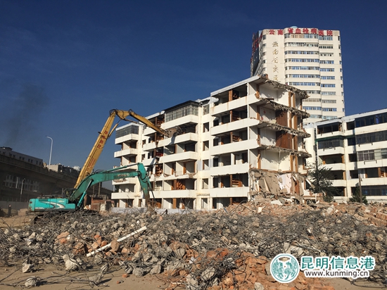 昆明信息港讯 通讯员夏雯 苏文忠 11月22日,官渡区吴井街道办事处按照昆明地铁6号线二期项目建设要求对涉及辖区内的东郊路161号小区住宅楼进行了拆除,确保地铁6号线菊华综合枢纽站的施工顺利实施。