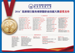 在颁奖典礼现场,昆明市人力资源和社会保障局副局长闫晓陵对获奖名单进行公布。在个人奖项方面,招商银行昆明分行赵小天、中信银行龙泉支行雷玉娟、中国工商银行护国支行陆蕾等10名选手荣获“2016年昆滇金牌大堂经理”称号;华夏银行城北支行崔加明、中国银行环城南路支行李娟、中国建设银行南亚壹城支行龚南予等10名选手荣获“2016年昆滇金牌理财经理”称号。其中“金牌大堂经理”和“金牌理财经理”第一名分别由中国银行东风支行的周超与中国建设银行螺蛳湾第二支行的敖翔夺得。