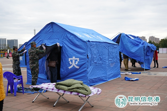 演练场景假设为,新亚洲体育城片区发生4级地震,居民紧急避震,社区工作人员紧急疏散辖区居民,转移安置受灾居民。按照《昆明市自然灾害救助应急预案》和《官渡区突发公共事件总体应急预案》的要求,官渡区民政局立即启动灾害应急响应。现场成立应急指挥部办公室,召开了救助应急领导组紧急会议,在救助应急指挥部的领导下,按照民政应急队伍管理规程,各个应急分队各司其职、展开工作。