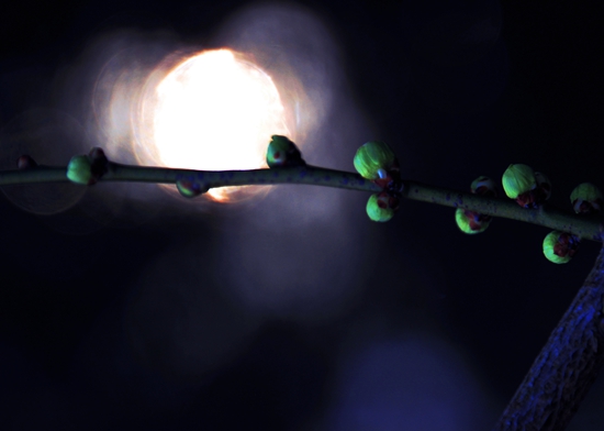 图片说明:当时阳光反射在水面上,在含苞的梅花枝头闪烁摇曳,于是灵光一动,拍了下来。照片中呈现多重光晕,调整对比度和色度后形成水中月影的感觉