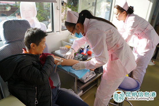 上午九点,在昆明市中心血站的采血车周围,已挤满了前来义务献血的公务员,在工作人员引导下,他们自觉排起了长队,认真填写登记表、测量血压,走上献血车进行最后的抽验血。