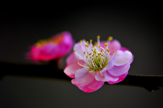 梅花的花型小,但微距镜下的梅花却绽放得如此美丽,虚实的对比,扑面而来的是生命绽放的美好,生机盎然!