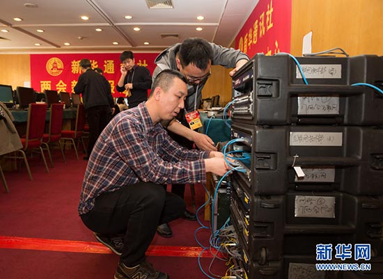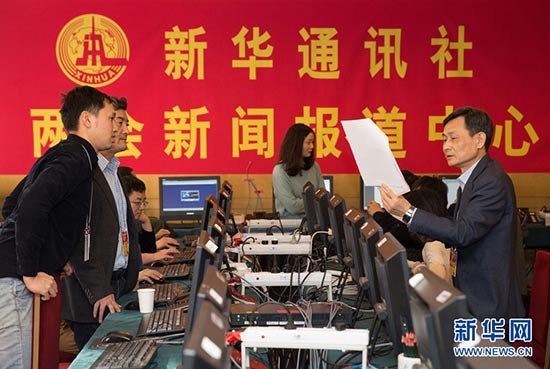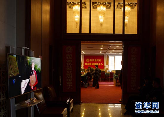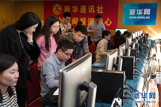 3月1日,新华社两会报道团成员在新华社设在人民大会堂的两会新闻报道中心发稿。十二届全国人大五次会议和全国政协十二届五次会议将分别于3月5日和3月3日在北京开幕。新华社设在人民大会堂的两会新闻报道中心1日正式运行。新华社记者 金立旺 摄