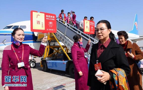 3月2日,出席十二届全国人大五次会议的广西代表团乘坐飞机抵达北京。新华社记者赵颖全/摄