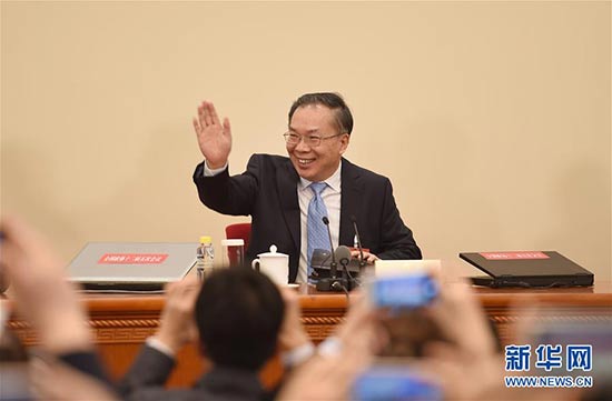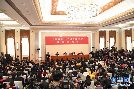 3月2日,全国政协十二届五次会议新闻发布会在北京人民大会堂举行,大会新闻发言人王国庆介绍会议有关情况并回答中外记者提问。 新华社记者李鑫 摄