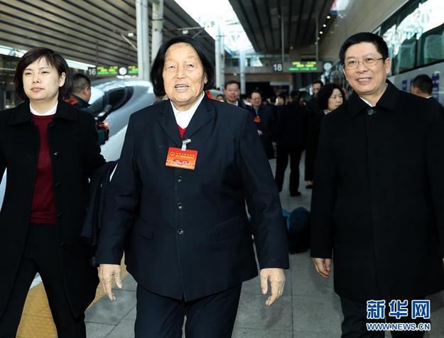 3月2日,出席十二届全国人大五次会议的山西代表团乘坐火车抵达北京西站。这是全国人大代表申纪兰(中)抵达北京西站。新华社记者 陈建力/摄