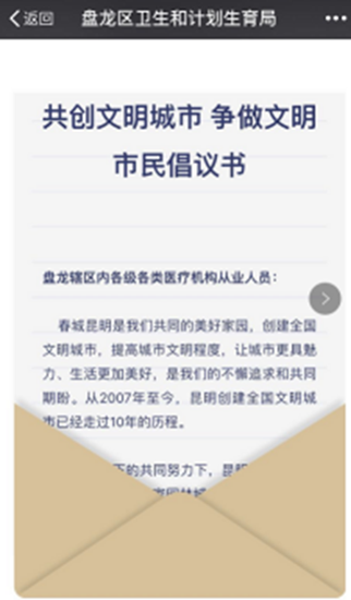 目前,盘龙区卫计局全国文明城市创建宣传氛围营造主要通过几种基本途径进行:一是在区卫计局微信公众平台、健康盘龙APP 、昆明信息港盘龙卫计专栏将我局创建活动的总体安排部署、创建工作动态及工作信息进行发布。二是通过免费发放倡议书、宣传画、宣传品等创城宣传资料,展开广泛宣传,已向辖区内500多家医疗机构、132个公共场所发放盘龙卫计系统《共创文明城市 争做文明市民倡议书》2000余份;印制了创城宣传画和宣传品3000份。三是辖区各级医疗机构利用LED屏进行了以文明城市创建为主要内容的创城宣传的公益广告和宣传标语,截至目前,盘龙区卫计局机关和区人民医院己全面完成了宣传氛围的营造,其它机构正在积极推进中。