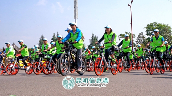 5月6日上午9:30,青年志愿者创文宣传活动在云南艺术家园启动。在启动仪式现场,文明志愿者宣读了“创城”倡议书。在摩拜共享单车的赞助下,青年志愿者沿河骑行在现场举行了首发。近500名青年志愿者由云南艺术家园出发,沿新宝象河骑行至云南省博物馆,并在“创城志愿者墙”签名留影。共享自行车骑行活动就是通过小手拉大手、文明环保共参与来宣传滇池保护和绿色出行。