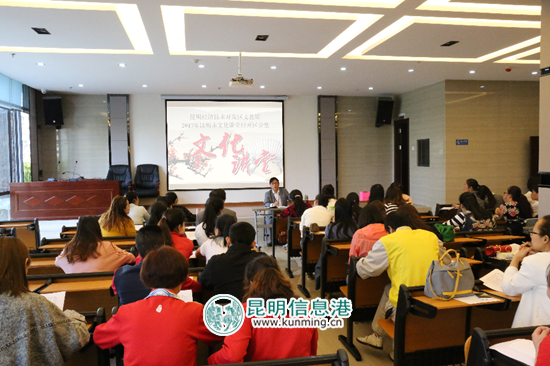 昆明信息港讯 通讯员冯靖凯 5月9日,昆明经开区文化馆举办“中华优秀传统文化大讲堂”,活动邀请了我省知名作家、音乐家、曲艺家、戏剧家柳青云老师讲授“优秀传统文化”,各社区工作人员和部分居民代表120余人参加了此次学习培训。