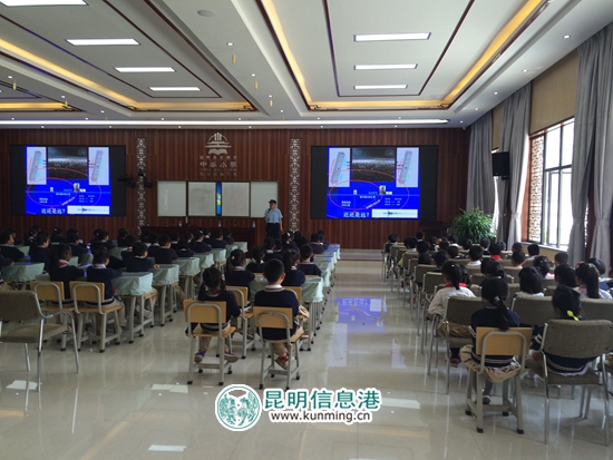 在中华小学海伦国际学校的演播大厅,200多名小学生现场聆听了云南省地震局专家带来的讲座。讲授专家利用大量图片、视频以及地震案例生动诠释了地震产生的原因、科学逃生的途径、面对地震时应有的举措,给在校师生们上了一堂生动的地震知识科普课。学校对讲座进行了联网直播,全校39个班级1700多名师生收听了讲座。