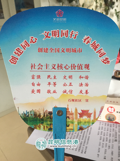 昆明信息港讯 通讯员冯靖凯 一把把设计精致的“创文宣传扇”扇出一阵阵文明之风。近日,昆明经开区阿拉街道石坝社区很多居民手中都拿着一把印有“创建同心、文明同行、春城同梦”和社会主义核心价值观字样的小扇子。