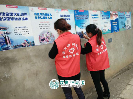 昆明信息港讯 通讯员冯靖凯 近日,昆明经开区洛羊街道大洛羊社区深入开展了一系列的宣传活动,营造了浓厚的宣传氛围,在辖区内张贴创城海报1000余张,大力宣传社会主义核心价值观和文明城市创建的相关知识。但随着雨季的到来以及一个多月以来的风吹日晒,有些张贴的海报出现了、残缺、脱落、褪色等现象。