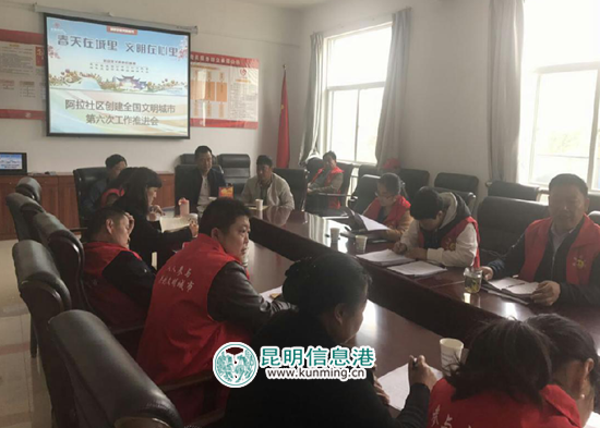 昆明信息港讯 通讯员冯靖凯 5月17日,昆明经开区阿拉街道阿拉社区组织社区全体工作人员及各小组书记、组长、副组长、文书召开创建全国文明城市工作第六次推进会。