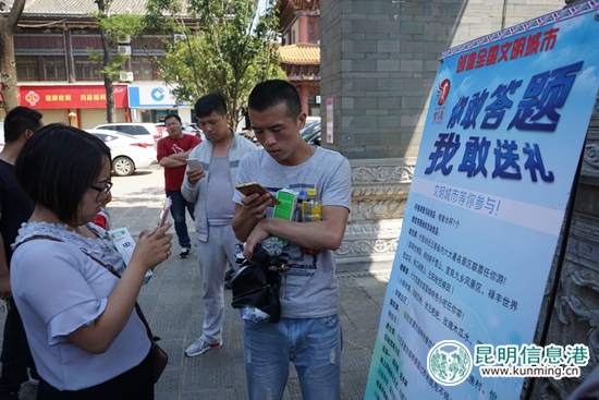 据悉,“创文有你 文明在行”的活动于5月20-21日,为期两天举行,志愿者将在官渡广场、官渡古镇、新螺蛳湾国际商贸城、大润发商业广场等人流量较大的11个重要场所对市民发放印有创文标语口号的手提袋、宣传折页以及纸巾等宣传物料,让市民快速了解创文信息。与此同时,官渡区还开展关注微信公众号“唯美官渡”参与创文答题抽奖,中奖的市民有望免费获得畅游云南世博旅游集团旗下六大景区(昆明世博园、昆明轿子雪山、宜良九乡风景区、禄丰世界恐龙谷、元阳哈尼梯田、丽江老君山)联票一套,价值569元,更有留焕小吃、怡得饭庄、古镇渔村、桥香园过桥米线等官渡古镇著名特色餐饮企业提供的丰厚奖品。