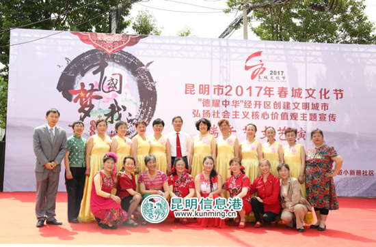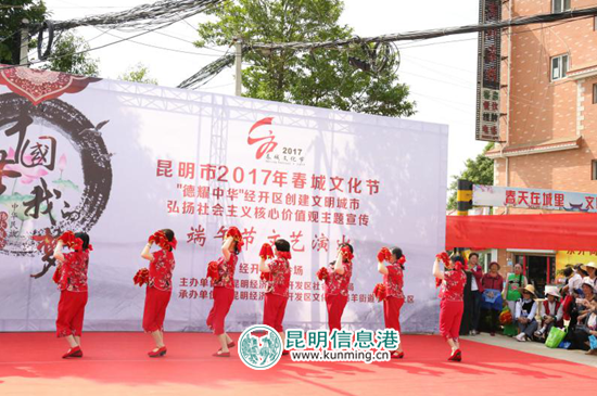 昆明信息港讯 通讯员冯靖凯 5月27日,由昆明经开区社会事业局主办,区文化馆、洛羊街道小新册社区承办的“2017年春城文化节‘德耀中华’经开区创建文明城市、弘扬社会主义核心价值观主题宣传端午节文艺演出”在小新册社区举行。